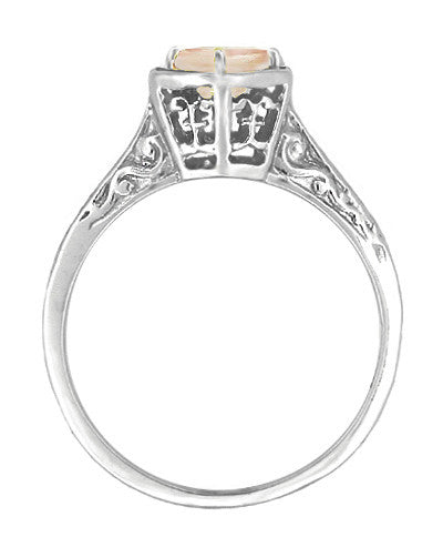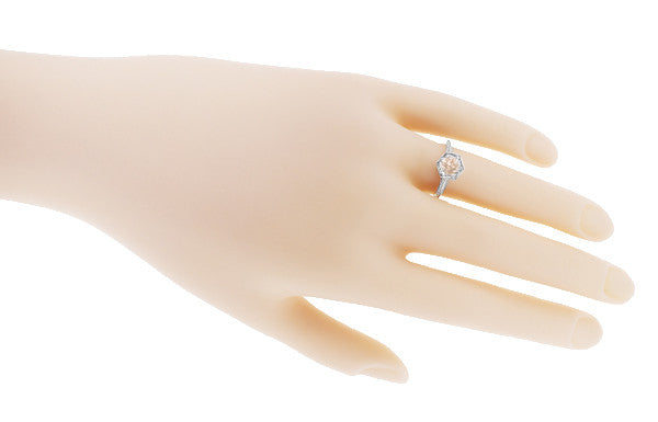 Filigree Engraved Art Deco Hexagon Morganite Ring in 14 Karat White Gold