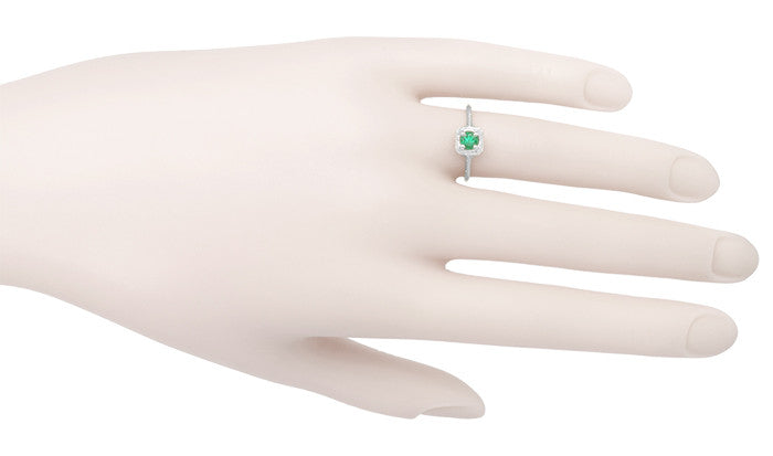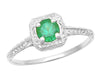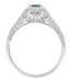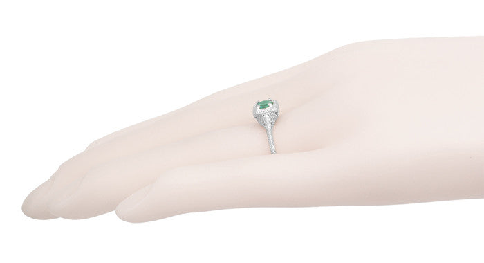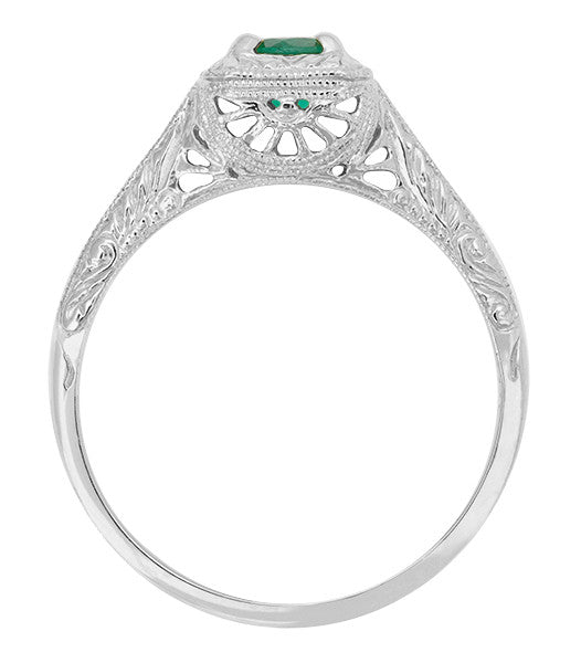 Art Deco Emerald Scrolls Engraved Filigree Engagement Ring in 14 Karat White Gold