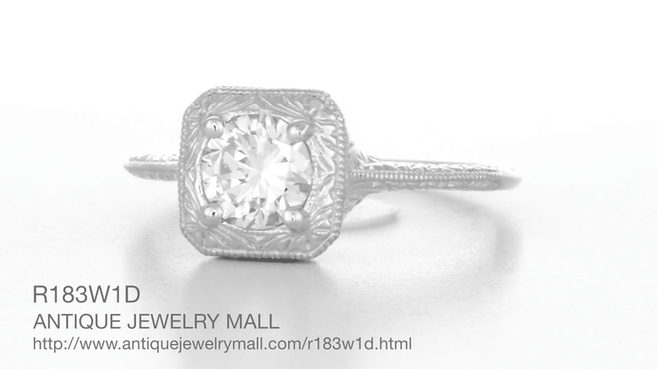 This gorgeous Art Deco filigree engagement ring is meticulously crafted in 14K white gold with a delicate pierced filigree design, hand finished with intricate engraved details. At its center is a 0.75 carat certified Ideal cut round brilliant cut diamond ( April Birthstone ) securely set in a four prong setting.