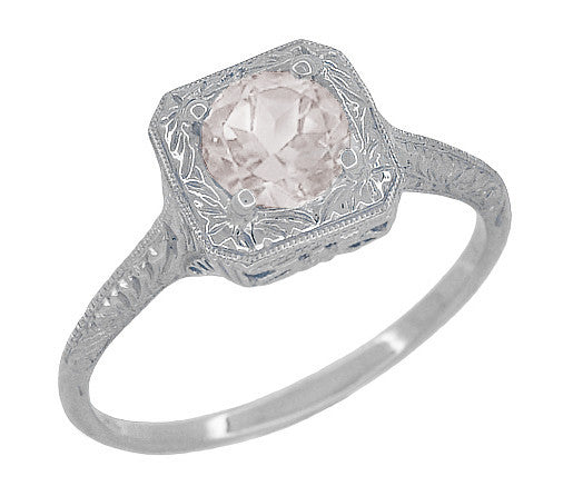 At its center is a shimmery very pale morganite gemstone weighing 0.45 carat, securely set in a low profile four prong setting. An exact reproduction of a 1920's vintage original engagement ring, this natural morganite ring is as easy to wear as it is beautiful.