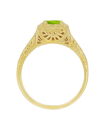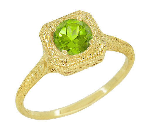 Art Deco Square Top Filigree Scrolls Engraved Peridot Engagement Ring in 14 Karat Yellow Gold