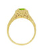 This artistic 14K yellow gold Art Deco filigree vintage style peridot ring is finely crafted with delicate hand finished pierced filigree, with a carved scroll pattern on the sides and around the square top of the ring.