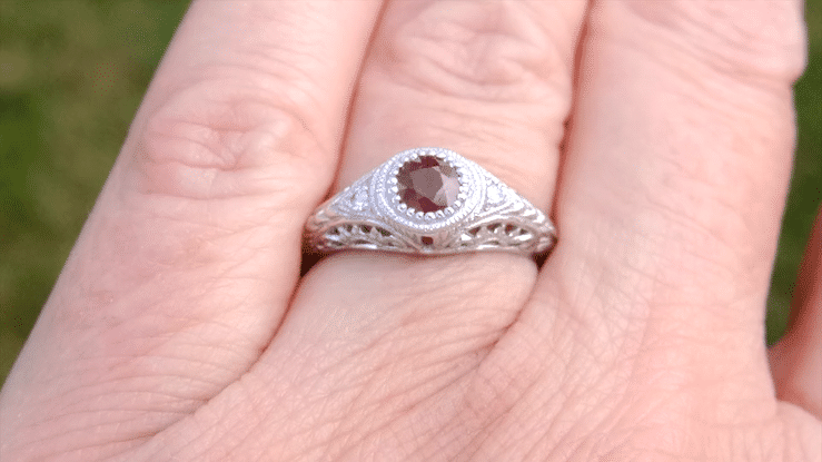 This beautiful filigree Art Deco antique platinum ruby engagement ring design features an intensely colored natural red ruby ( July Birthstone ) of 0.50 carat set into a secure bead bezel setting and framed by 2 shimmering F/G color and VS clarity round brilliant diamonds totaling 0.04 carat.