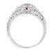 This exquisite vintage replica Art Deco platinum ruby ring features a low profile design which makes it a perfect choice for anyone who would like an heirloom quality ruby engagement ring that is easy to wear and will not "catch" on things and get in the way of a busy lifestyle.
