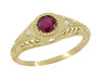 This gorgeous yellow gold Art Deco filigree ruby engagement ring features a shimmering natural red ruby ( July Birthstone ) of 0.50 carat at the center of a unique bead bezel setting, flanked by 2 round brilliant side diamonds totaling 0.04 carat.