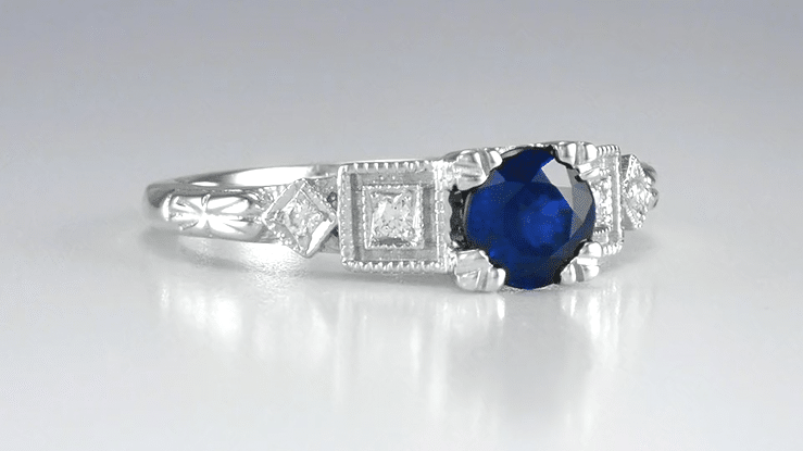 The artistic geometric engraved Art Deco design detailing on the sides is enhanced with four shimmering round diamonds of F/G color and VS clarity, totaling 0.06 carat, framing the center sapphire stone in a show of brilliance.