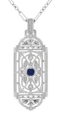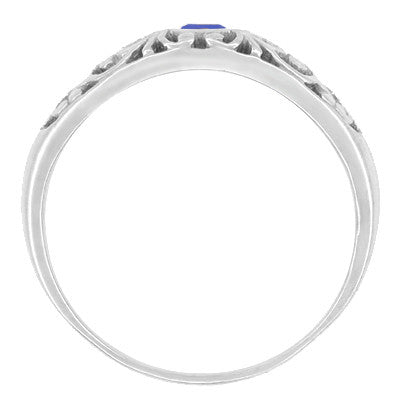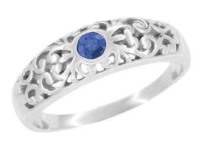This vintage filigree sapphire ring design features a low profile with a securely bezel set center sapphire gemstone, making it an excellent choice for anyone who would like a ring with antique detail, which will not "catch" on things and get in the way of a busy daily routine. This sapphire ring is also a good choice for anyone looking for one birthstone ring to serve as both an engagement and wedding ring.