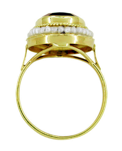 Victorian Oval Almandine Red Garnet and Seed Pearl Ring in 14 Karat Yellow Gold