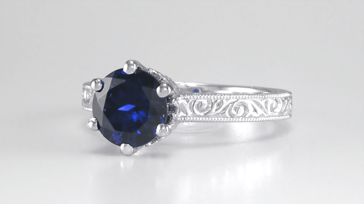 Platinum Filigree Art Deco Crown Solitaire 1.5 Carat Blue Sapphire Engagement Ring - Engraved Scroll Design