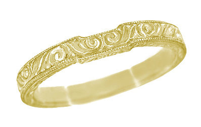 Finely engraved with an heirloom scroll pattern on the three outward facing sides of the ring, the band is edged with beaded millgrain for elegant shimmer.