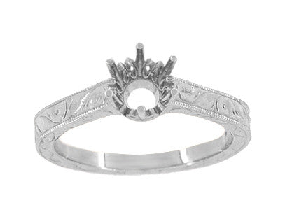 This exquisite vintage style 1/3 carat Art Deco white gold solitaire engagement ring setting features a secure six prong filigree crown mounting as the perfect frame for your valuable round diamond. Crafted in your choice of 18K white gold or 14K white gold, the band is decorated with an heirloom engraved scroll pattern on the three outward facing sides of the ring, bordered with shimmery beaded millgrain edging - the perfect finishing touch! The band of the ring measures 2.5 millimeters wide and the setting sits 6.9 millimeters off the finger.