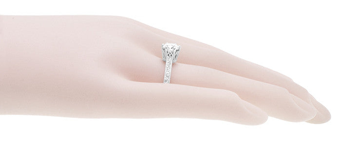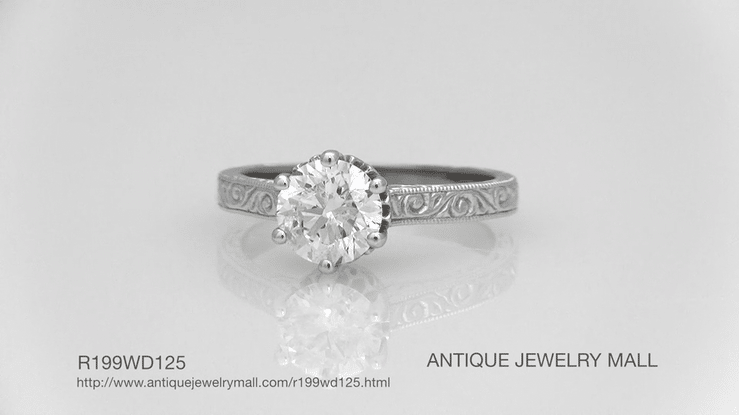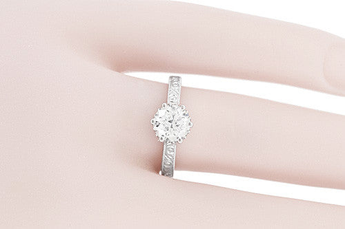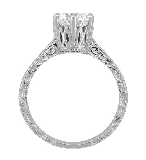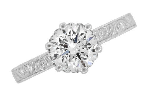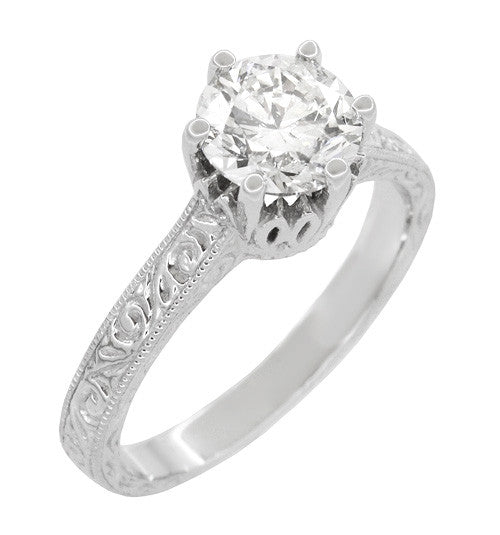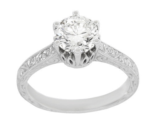 Art Deco Filigree Scrolls Tiara Crown 1.25 Carat Solitaire Diamond Engraved Engagement Ring in White Gold