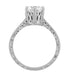 This solitaire diamond tiara engagement ring is exquisitely decorated with an engraved scroll pattern on the three outward facing sides of the ring, bordered with light scattering millgrain edging as the perfect finishing touch. The band of the ring measures 2.8 millimeters wide and the setting sits 7.5 millimeters off the finger.
