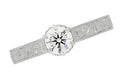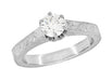 A finely carved scroll pattern decorates the three outward facing sides of this 1920's antique style diamond engagement ring, bordered with light scattering beaded millgrain edges for the perfect finishing touch to this vintage design heirloom solitaire ring.