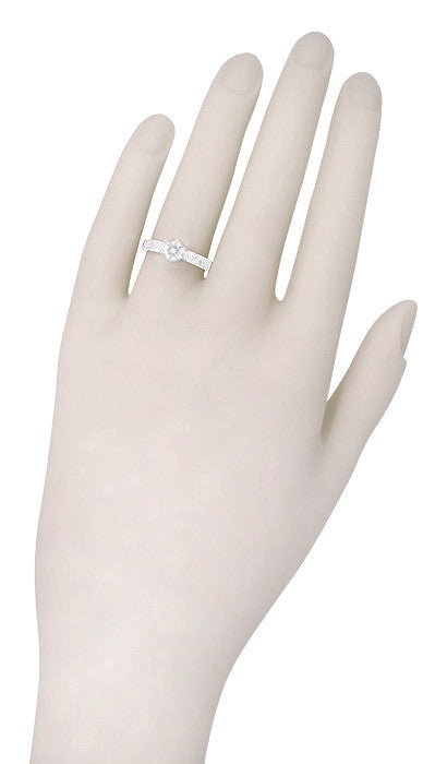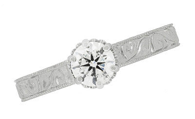 Art Deco Crown Filigree Scrolls Engraved 1/3 Carat Solitaire Diamond Engagement Ring in White Gold