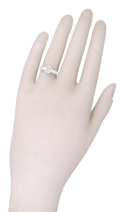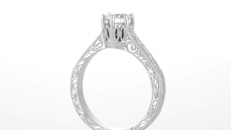 This classic solitaire diamond engagement ring is exquisitely adorned with an antique engraved scroll pattern on the three outward facing sides of the ring, bordered with light scattering millgrain edging as the perfect finishing touch.