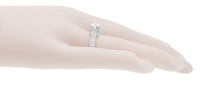 Art Deco Crown Filigree Scrolls 3/4 Carat Solitaire Diamond Engraved Filigree Engagement Ring in 18 Karat White Gold