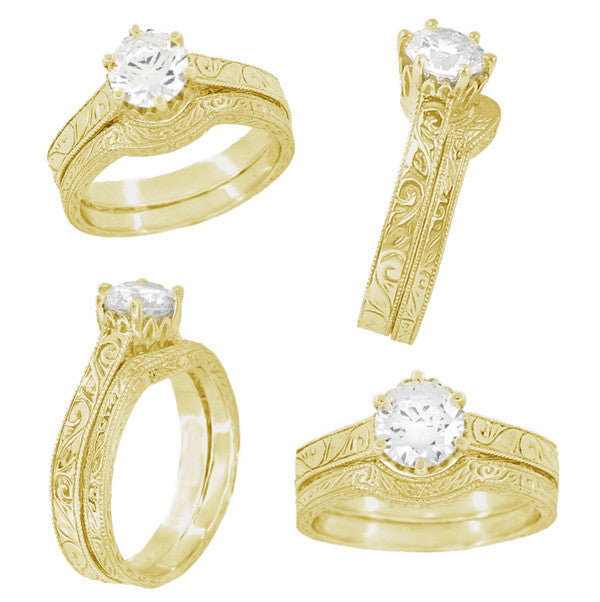 Crafted to order in your choice of 14K or rich 18K yellow gold,The band features an artistic sculptural engraved scroll pattern on the three outward facing sides of the ring, bordered with shimmery hand applied millgrain edging to frame the lovely carved design.