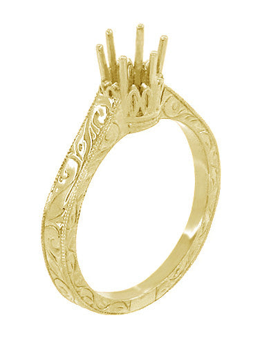 This romantic vintage style Art Deco yellow gold solitaire crown engagement ring setting for a 1/2 carat diamond features a six prong filigree round crown setting for your round shape diamond or gemstone. The band is artisan engraved with an heirloom scroll pattern on the three outward facing sides of the ring, with traditional light scattering millgrain adding shimmer and depth to the edges of the design.
