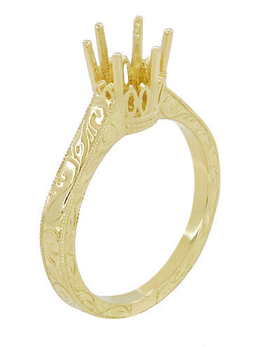 Crafted to order in your preference of solid 18K or 14K yellow gold, this lovely ring mounting is exquisitely adorned with a hand engraved scroll pattern on the three outward facing sides of the ring, bordered with beaded millgrain edging.