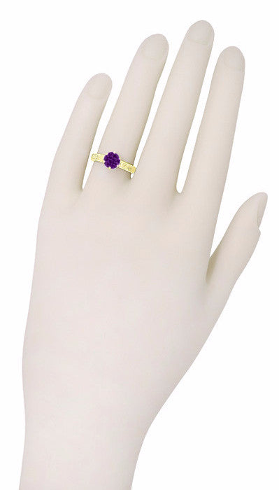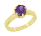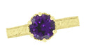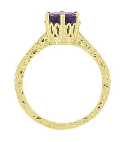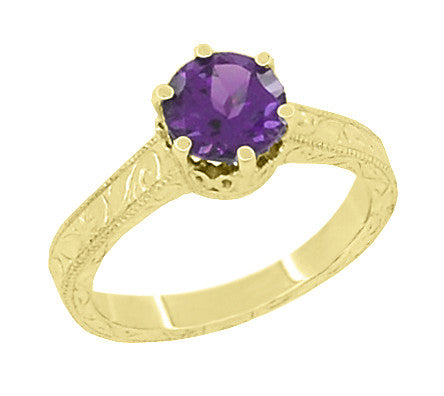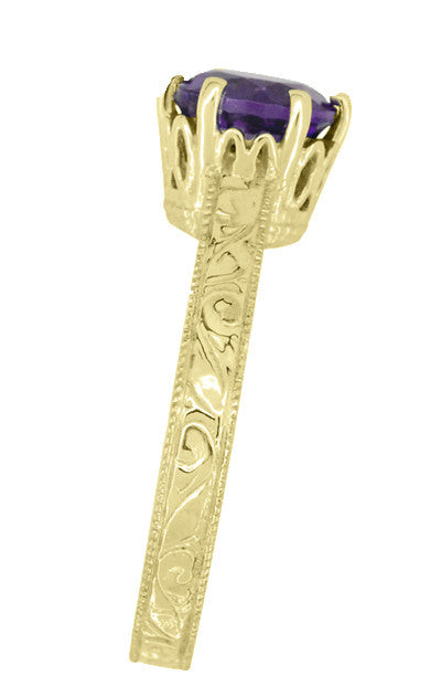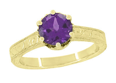 Art Deco Carved Scrolls Filigree Crown Solitaire Amethyst Engagement Ring in 18 Karat Yellow Gold