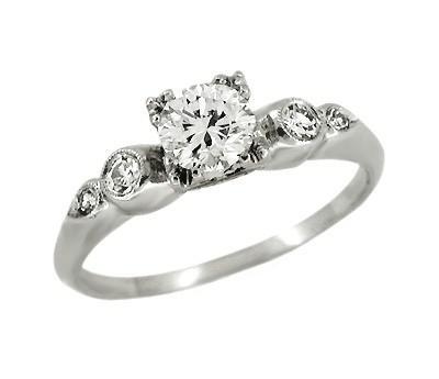 Rosalie is a classic Retro Moderne vintage diamond engagement ring in 14K white gold, circa 1950's. A beautiful center diamond of 0.20 carat, G/H c...