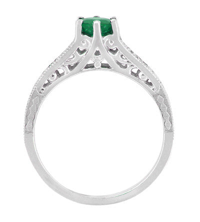 Finely crafted in 14K white gold, this lovely artisan emerald engagement ring is an exact reproduction of a circa 1920's antique filigree engagement ring, and features intricately detailed engraving on the top of the band with its sides adorned with delicate pierced filigree scrollwork.