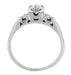 At its center is a high quality VS clarity and H color 0.13 carat Old European cut solitaire diamond which radiates pure joy from atop a secure fishtail box setting. Two shimmering single cut securely four prong set diamonds measuring 0.025 points each accompany the center stone and echo its jubilance. Total diamond weight for the ring is 0.18 carat.