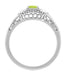 Measuring 6.2 millimeters wide at the top of the ring and tapering down to 1.7 millimeters wide at the bottom of the band, this lovely peridot ring sits a low 3/16 inch off the finger. Artisan hand finished, this wearable 1920's vintage inspired peridot engagement ring has a timeless style and a simple appeal that is sure to be cherished!