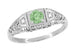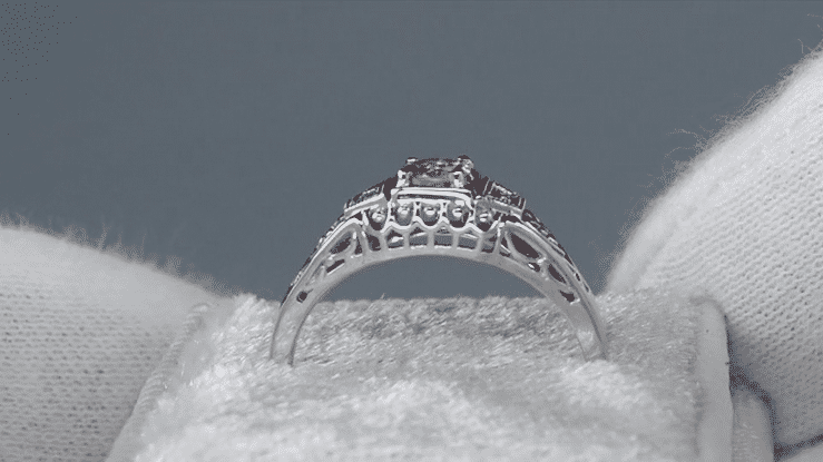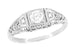 Crafted in 14K white gold, the ring is accented with 2 round brilliant diamonds embedded on the sides in a low dome cage of finely detailed pierced filigree openwork. Measuring 6.2 millimeters wide at the top of the ring and tapering down to 1.7 millimeters wide at the bottom of the band, this lovely 1920's style ring sits a low 3/16 inch off the finger.