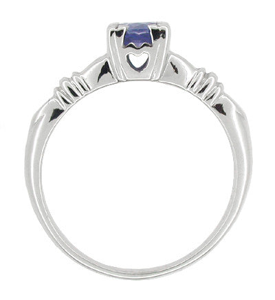 Each prong is a three-leaf clover, with hearts at the sides of the setting for a truly romantic touch. Harvest bands to the left and right of the beautiful sapphire are a symbol of prosperity and complete the delightful presentation. This romantic original Art Deco vintage sapphire engagement ring reissue is sure to be appreciated as a promise ring or a birthstone engagement.
