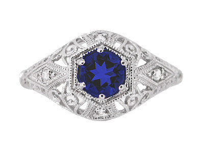 Measurements are 3/8 inch wide at the top of the ring, rising 3/16 inch off the finger. The timeless beauty of this exquisite hexagonal Edwardian sapphire engagement ring is sure to make it a family heirloom to be cherished for generations to come.