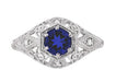 Meticulously artisan crafted, this gorgeous vintage blue sapphire engagement ring reproduction, circa 1910, features an elegant dome of delicate pierced filigree finished with fine engraved details and beaded milgrain edging.