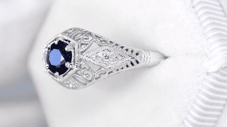 Edwardian Sapphire and Diamonds Scroll Dome Filigree Engagement Ring in Platinum