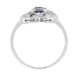 The classic engraved geometric Deco design features pierced filigree openwork and three natural blue sapphires set flush into the center of the design. This attractive 3 stone vintage inspired right hand sapphire ring has a low profile, making it a good choice for anytime wear.