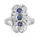 Art Deco Filigree Three Stone Blue Sapphires Cocktail Statement Ring in 14 Karat White Gold