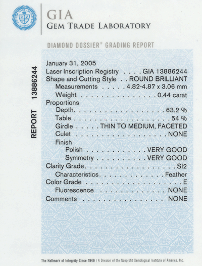 This engagement ring includes an independent diamond report for the natural center diamond from the Gemological Institute of America (GIA).