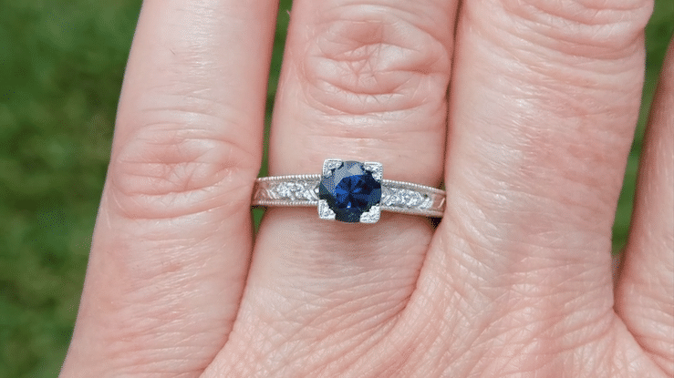 In the European tradition of having a sapphire ( September Birthstone ) as the centerpiece of an engagement ring, this ring makes a wonderful alternative to the usual diamond engagement ring.