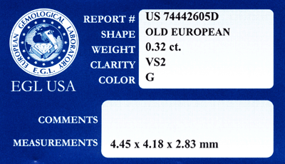This ring includes a diamond certificate for the center diamond from the European Gemological Laboratory (EGL).