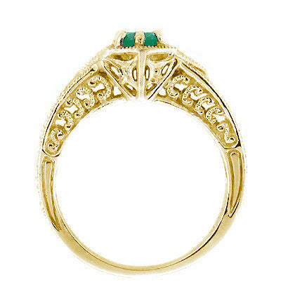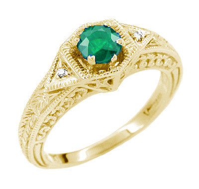 Yellow Gold Art Deco Filigree Engraved Emerald and Diamond Engagement Ring