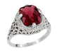 Crafted in an elegant vintage pierced filigree design, this vintage solitaire garnet ring design showcases an intricately detailed engraved flowers and leaves motif. The classic antique style of this beautiful heirloom rhodolite garnet filigree ring is sure to be adored!
