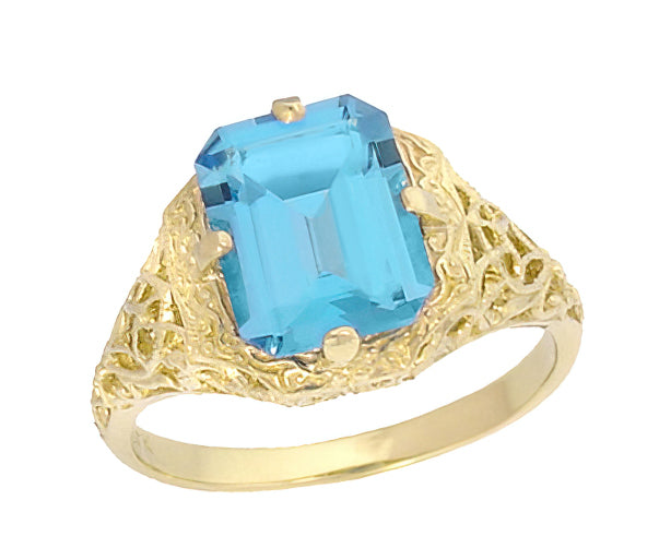 This stunning vintage style 14K yellow gold Art Deco filigree blue topaz ring features a gorgeous natural rectangular swiss blue topaz ( December Birthstone ) of 3.70 carats, radiant with bold color at the center of a secure four prong setting.