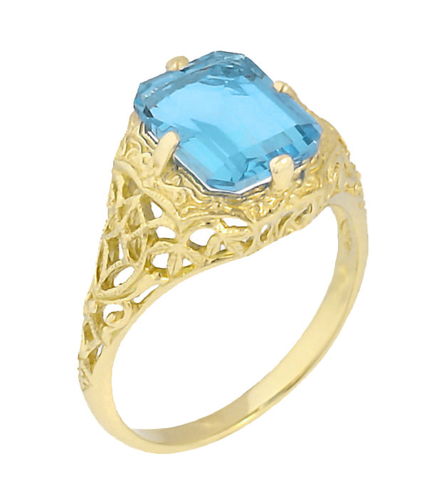 Radiantly regal, this beautiful antique blue topaz ring replica is artisan crafted in delicate 14K yellow gold pierced filigree flowers and leaves and hand finished with shimmery milgrain edges. The timeless appeal of this exquisite filigree swiss blue topaz ring is sure to be noticed!