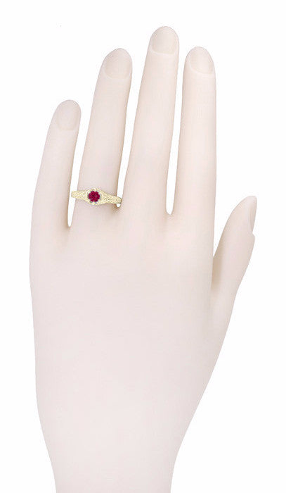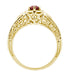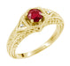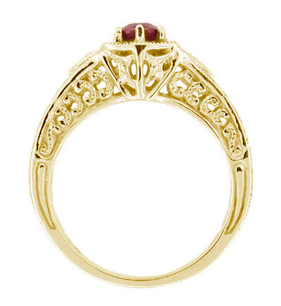 A finely detailed engraved wheat pattern adorns the top side of the ring, accented with engraved millgrain beaded edging on the outside top of the band. Lovely delicate pierced filigree scrollwork on the sides perfectly completes this beautiful classic antique ruby ring design in 14K yellow gold.