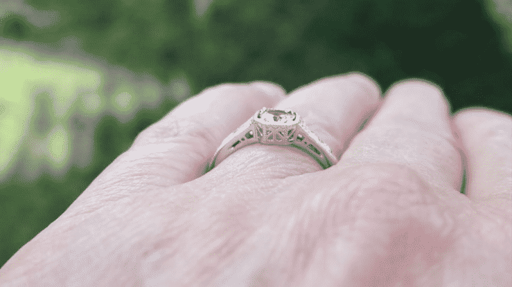 The design of this low profile white sapphire ring makes it an excellent choice for anyone who would like an heirloom quality ring with antique style details, which will not "catch" on things and get in the way of a busy daily routine.