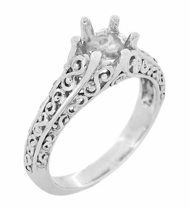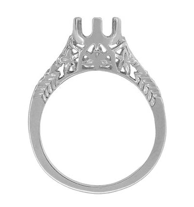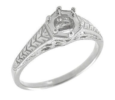 Beautifully detailed, this platinum antique reissue Art Deco solitaire ring setting  for a round 3/4 carat diamond features a secure six prong filigree crown setting adorned with leaves, and a wheat pattern along the sides of the ring as a frame for the center crown.