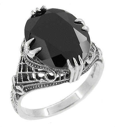 Gothic Filigree Black Onyx Claw Ring in Sterling Silver - Art Deco Engraved