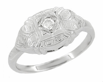 This simple filigree Art Deco diamond engagement ring in white gold features a low set four prong set round brilliant cut diamond of 0.12 carat, F/...