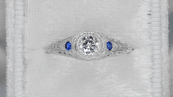 Platinum Art Deco Vintage Engraved Filigree Diamond Engagement Ring with Side Blue Sapphires