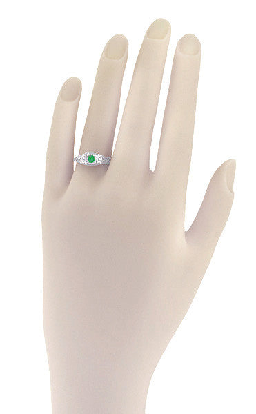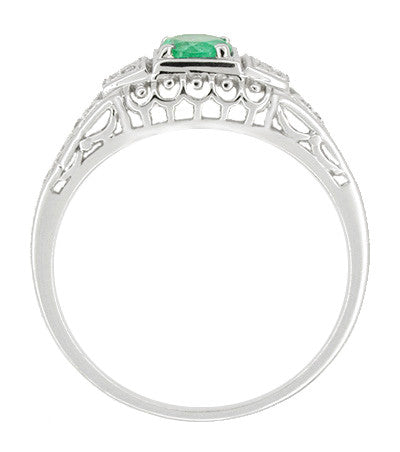 Art Deco Emerald and Diamond Low Profile Filigree Engagement Ring in 14 Karat White Gold